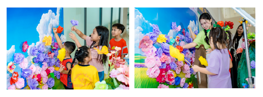 Sau khi được các nghệ nhân khiếm thính hướng dẫn làm hoa tái chế, các bạn nhỏ sẽ được cắm bông hoa đã tự tay làm lên bức tường hoa tại Merry Plaza Richmond City.
